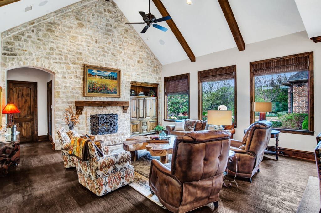 Stunning, private, wooded, creek lot in a prestigious gated community. Enter double iron and glass doors to a dramatic sweeping staircase. Entertainer’s dream with the main level, wood-paneled office with fireplace. Dining room complete with climate-controlled wine room. The Kitchen with oversized island, hidden pantry, and top-of-the-line appliances opens to the great room with a wall of windows, scraped hardwood flooring, limestone wall, fireplace, cathedral ceilings, and wet bar! Owner’s suite with built-ins, fireplace and hardwood floors, sitting area overlooking the pool. Workout room off master with door to backyard. Ensuite bathroom with his and hers closets with built-ins, double shower, and jetted tub. Upper-level with a large computer nook with storage closet, game room with built-ins and storage closet, and movie room with theatre-style seating. Backyard oasis with 4 outdoor living areas, 1 upper and 1 lower. Covered patio with fireplace, kitchen with bar seating, built-in grill, sink, refrigerator, and gas fireplace with TV mounting. Amazing sunset views! Amenity-rich community minutes away from it all!