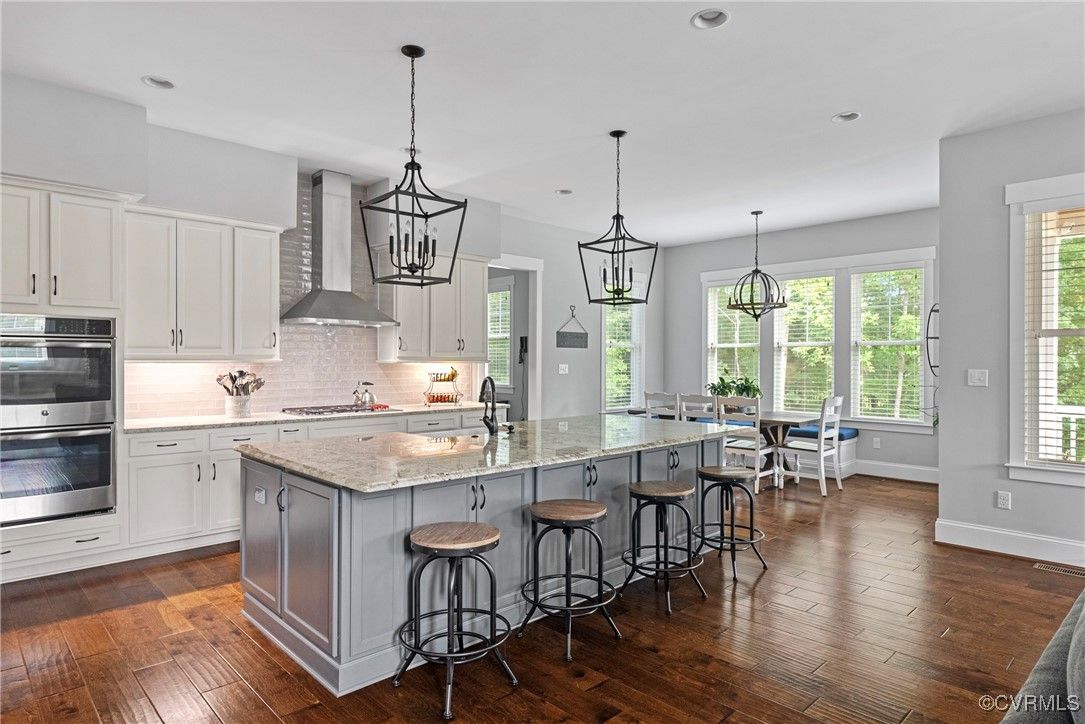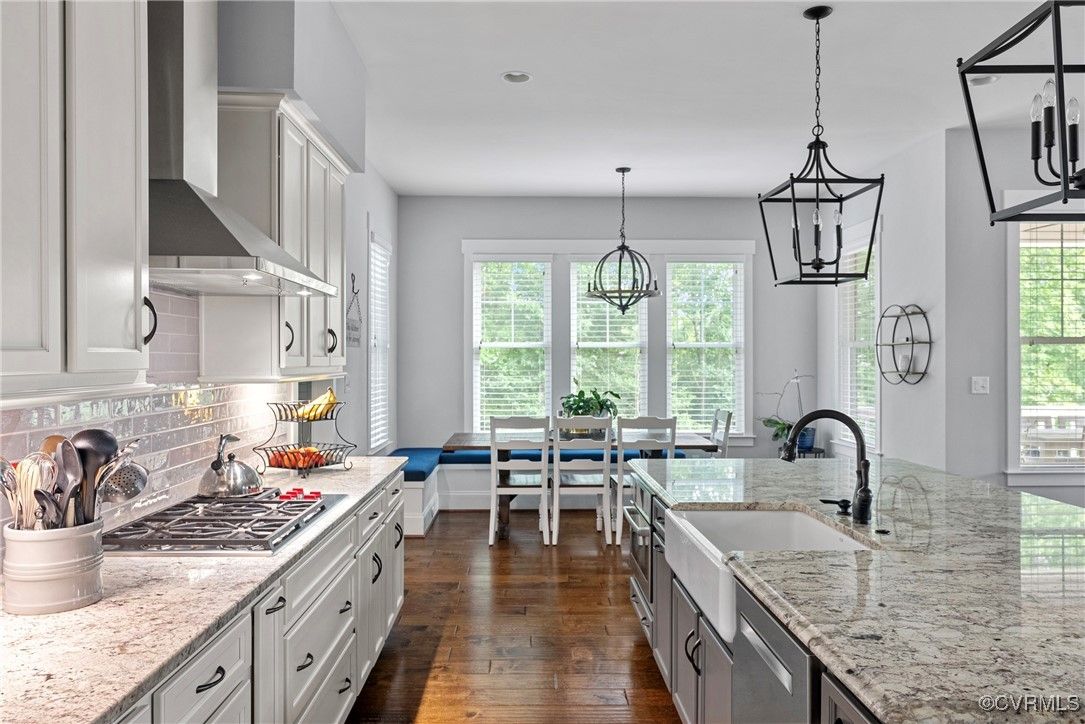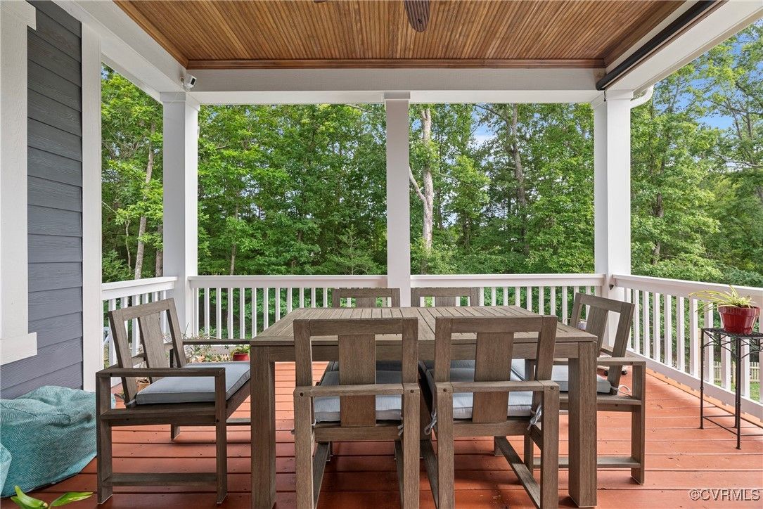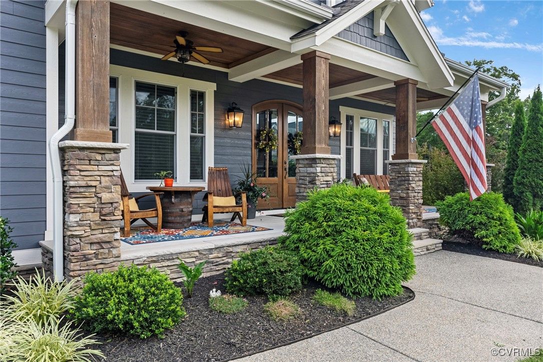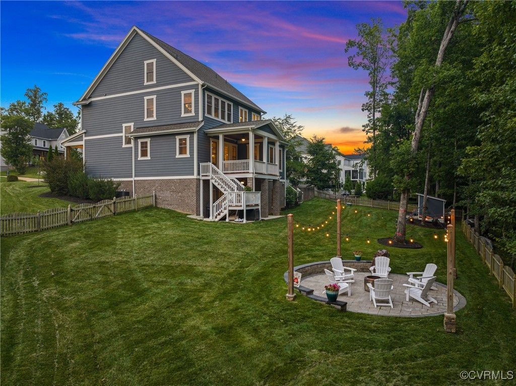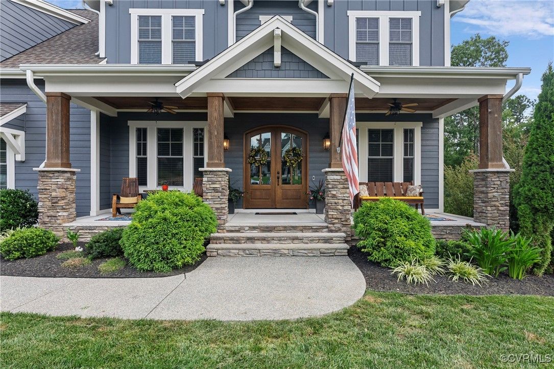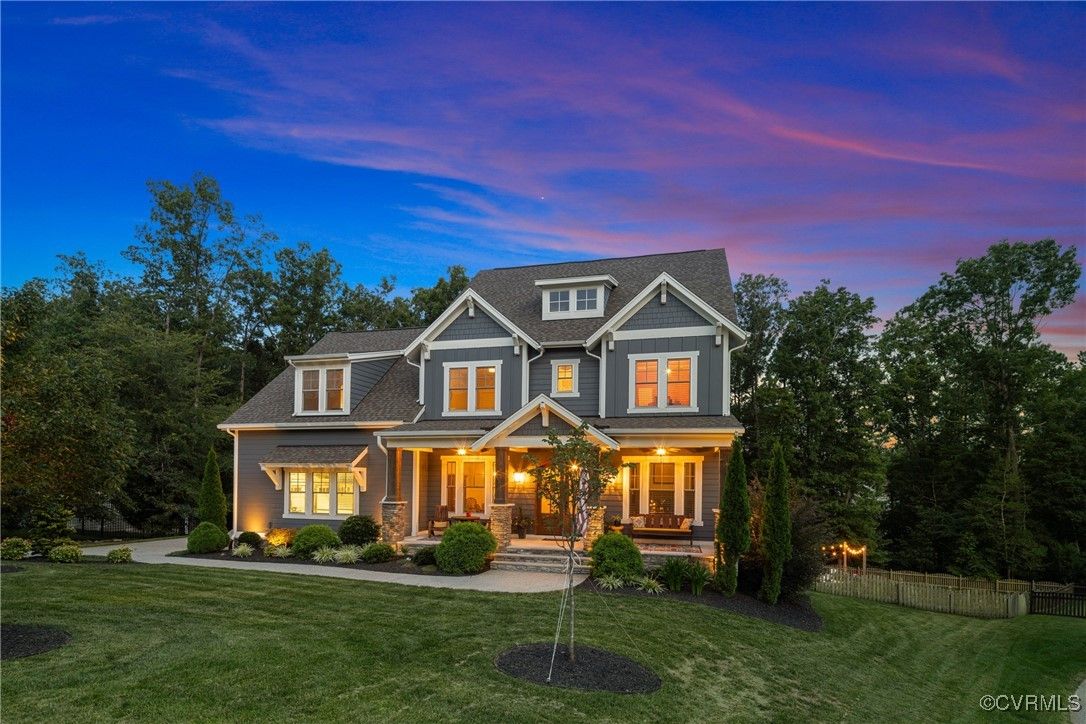 Welcome Home to this stunning, custom-built craftsman home in the heart of Hallsley, where sophistication meets modern luxury in sought after Midlothian. Note the detail of the architecture and grand facade of the rocking chair front porch and entry way. Guests are greeted by an inviting Foyer and spacious open Great Room with natural lighting, cozy stone gas log fireplace, and built-in speakers. The Chef's Dream Kitchen has oversized island, premium granite countertops, upgraded 48" cabinets, stainless double oven, gas cooktop, butler's pantry, and breakfast area with built-in storage benches. The elegant Dining Room is perfect for hosting, and the first-floor office/study has built-in bookcases and custom wainscoting. Character and charm along with gorgeous hardwood flooring and 10' ceilings are throughout the first floor. The well-designed 2nd floor has a luxurious primary owner's suite with hardwood floors, spa-like en-suite bathroom with soaking tub, large double vanity, and oversized tiled shower, and a gigantic walk-in closet. The 2nd largest bedroom has a private bathroom and walk-in closet. Bedrooms 3 and 4 share a good-sized jack & jill bathroom. The beautifully designed laundry room features a wash sink, built-in cabinets, folding counter area. The 3rd floor walk-up attic is roughed in for a 5th bath and can be finished. The walk-out basement is perfect for entertaining! If you wish to host a big party to watch the Olympics or convert to an in-law suite, the large recreational room has multiple TVs and built-in speakers, wet bar equipped with two-tap kegerator and wine fridge. Also exercise room with rubber floor, full bathroom and unfinished storage. Step out to the cozy and private back patio; enjoy your backyard oasis including a recently added gorgeous stone firepit area with party lights, fun play area, gardening space, and mature landscaping against wooded backdrop. The triple car garage is finished and has excellent storage with built-in cabinets.