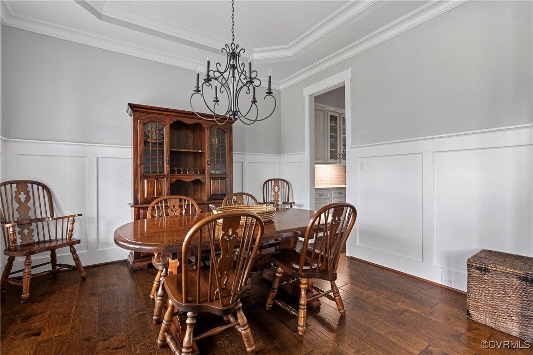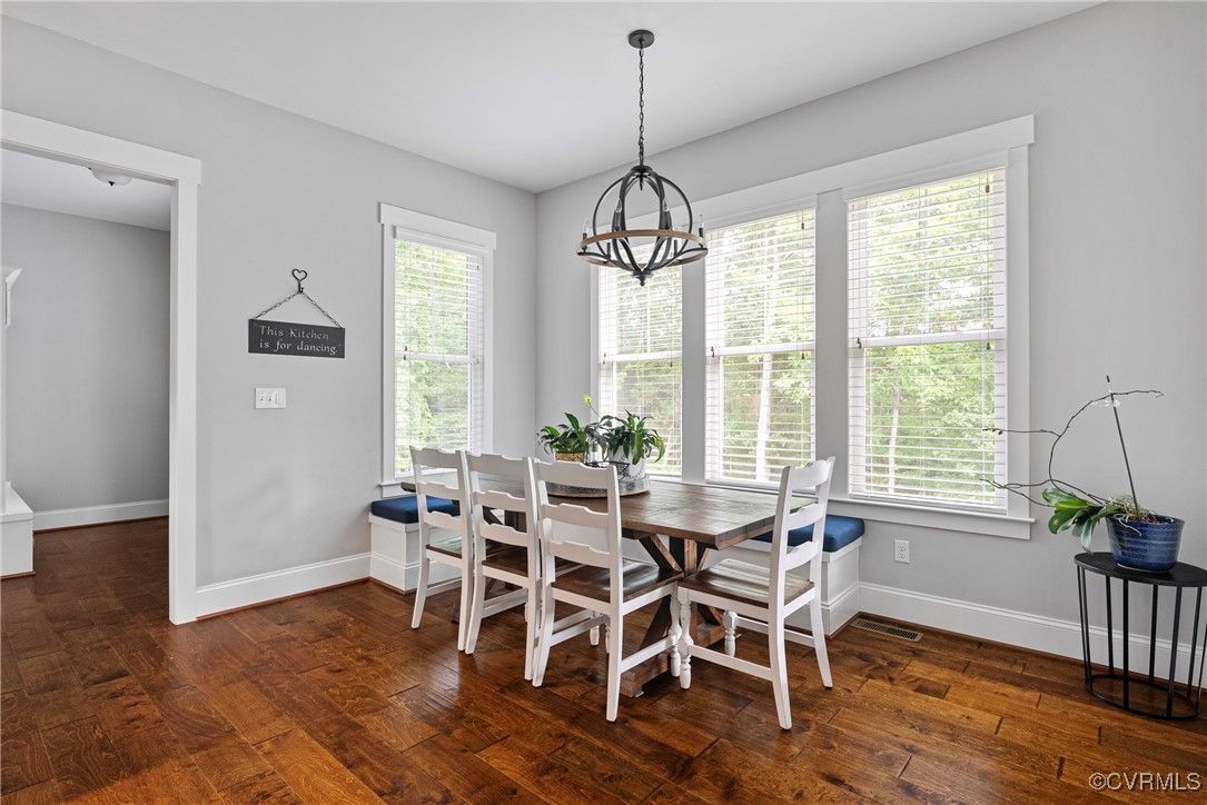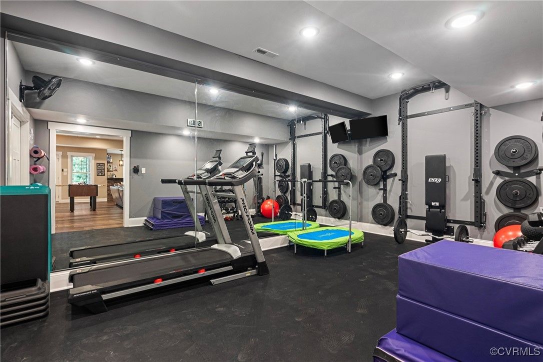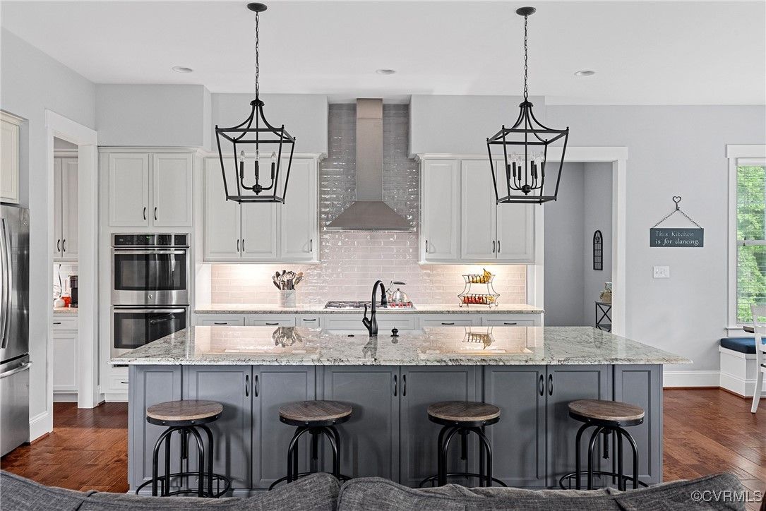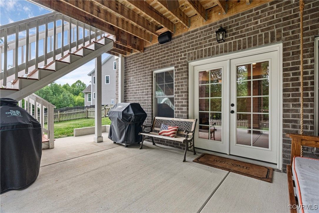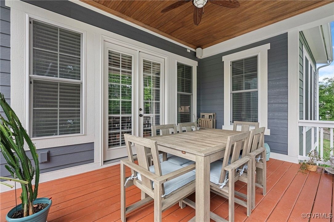 Welcome Home to this stunning, custom-built craftsman home in the heart of Hallsley, where sophistication meets modern luxury in sought after Midlothian. Note the detail of the architecture and grand facade of the rocking chair front porch and entry way. Guests are greeted by an inviting Foyer and spacious open Great Room with natural lighting, cozy stone gas log fireplace, and built-in speakers. The Chef's Dream Kitchen has oversized island, premium granite countertops, upgraded 48" cabinets, stainless double oven, gas cooktop, butler's pantry, and breakfast area with built-in storage benches. The elegant Dining Room is perfect for hosting, and the first-floor office/study has built-in bookcases and custom wainscoting. Character and charm along with gorgeous hardwood flooring and 10' ceilings are throughout the first floor. The well-designed 2nd floor has a luxurious primary owner's suite with hardwood floors, spa-like en-suite bathroom with soaking tub, large double vanity, and oversized tiled shower, and a gigantic walk-in closet. The 2nd largest bedroom has a private bathroom and walk-in closet. Bedrooms 3 and 4 share a good-sized jack & jill bathroom. The beautifully designed laundry room features a wash sink, built-in cabinets, folding counter area. The 3rd floor walk-up attic is roughed in for a 5th bath and can be finished. The walk-out basement is perfect for entertaining! If you wish to host a big party to watch the Olympics or convert to an in-law suite, the large recreational room has multiple TVs and built-in speakers, wet bar equipped with two-tap kegerator and wine fridge. Also exercise room with rubber floor, full bathroom and unfinished storage. Step out to the cozy and private back patio; enjoy your backyard oasis including a recently added gorgeous stone firepit area with party lights, fun play area, gardening space, and mature landscaping against wooded backdrop. The triple car garage is finished and has excellent storage with built-in cabinets.