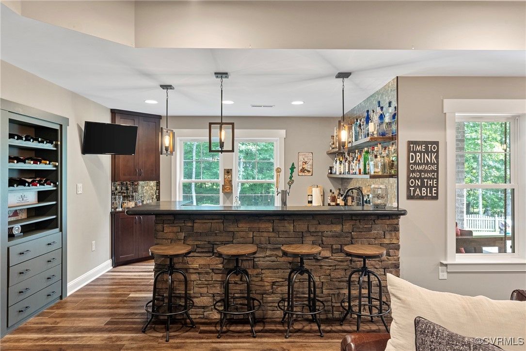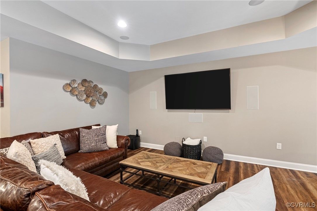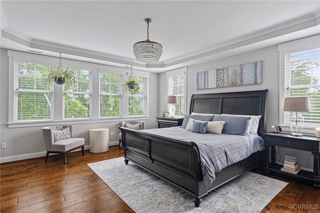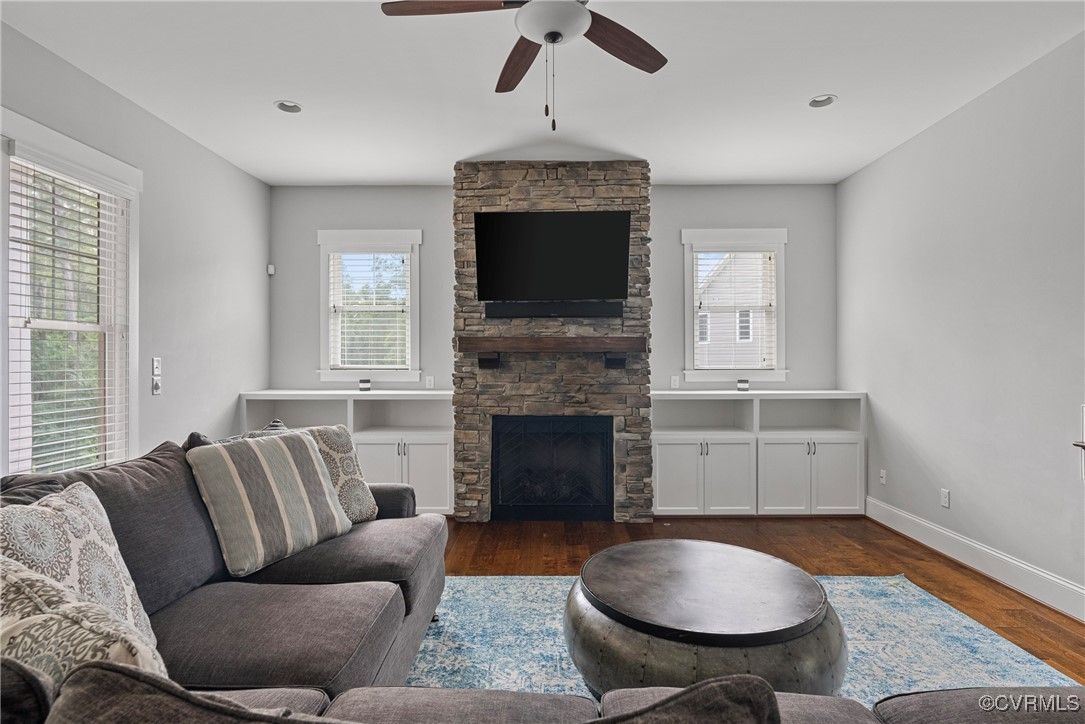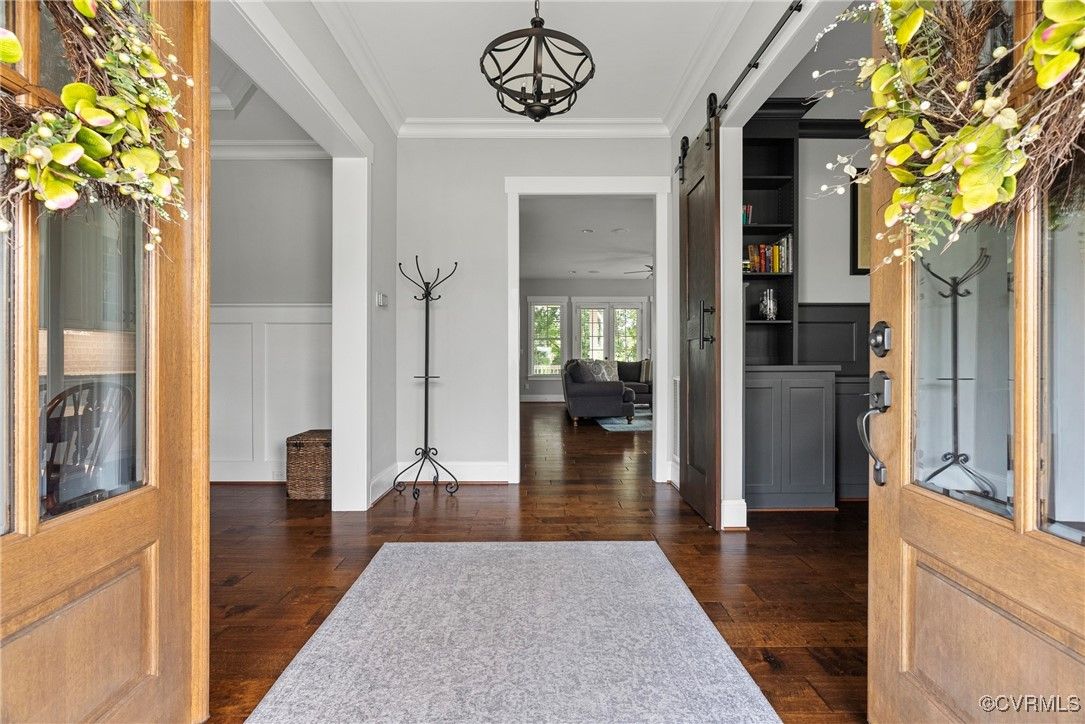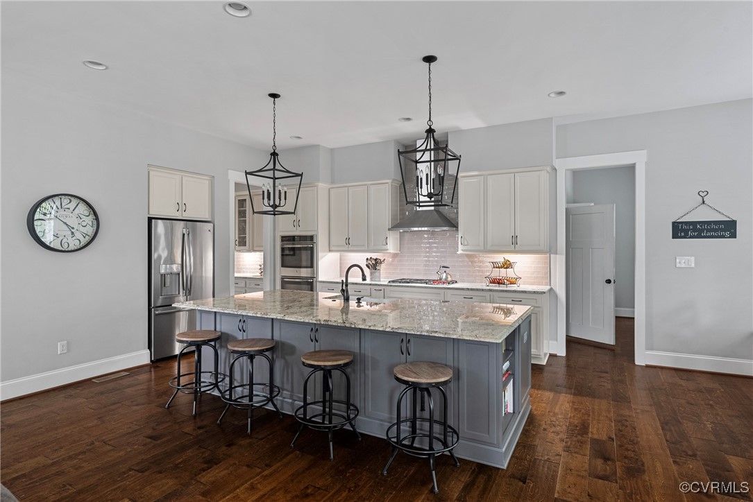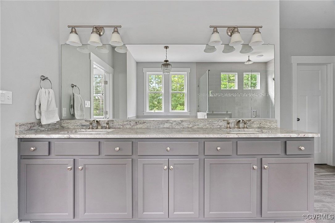 Welcome Home to this stunning, custom-built craftsman home in the heart of Hallsley, where sophistication meets modern luxury in sought after Midlothian. Note the detail of the architecture and grand facade of the rocking chair front porch and entry way. Guests are greeted by an inviting Foyer and spacious open Great Room with natural lighting, cozy stone gas log fireplace, and built-in speakers. The Chef's Dream Kitchen has oversized island, premium granite countertops, upgraded 48" cabinets, stainless double oven, gas cooktop, butler's pantry, and breakfast area with built-in storage benches. The elegant Dining Room is perfect for hosting, and the first-floor office/study has built-in bookcases and custom wainscoting. Character and charm along with gorgeous hardwood flooring and 10' ceilings are throughout the first floor. The well-designed 2nd floor has a luxurious primary owner's suite with hardwood floors, spa-like en-suite bathroom with soaking tub, large double vanity, and oversized tiled shower, and a gigantic walk-in closet. The 2nd largest bedroom has a private bathroom and walk-in closet. Bedrooms 3 and 4 share a good-sized jack & jill bathroom. The beautifully designed laundry room features a wash sink, built-in cabinets, folding counter area. The 3rd floor walk-up attic is roughed in for a 5th bath and can be finished. The walk-out basement is perfect for entertaining! If you wish to host a big party to watch the Olympics or convert to an in-law suite, the large recreational room has multiple TVs and built-in speakers, wet bar equipped with two-tap kegerator and wine fridge. Also exercise room with rubber floor, full bathroom and unfinished storage. Step out to the cozy and private back patio; enjoy your backyard oasis including a recently added gorgeous stone firepit area with party lights, fun play area, gardening space, and mature landscaping against wooded backdrop. The triple car garage is finished and has excellent storage with built-in cabinets.