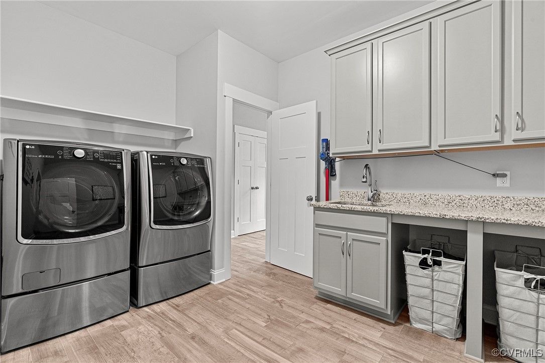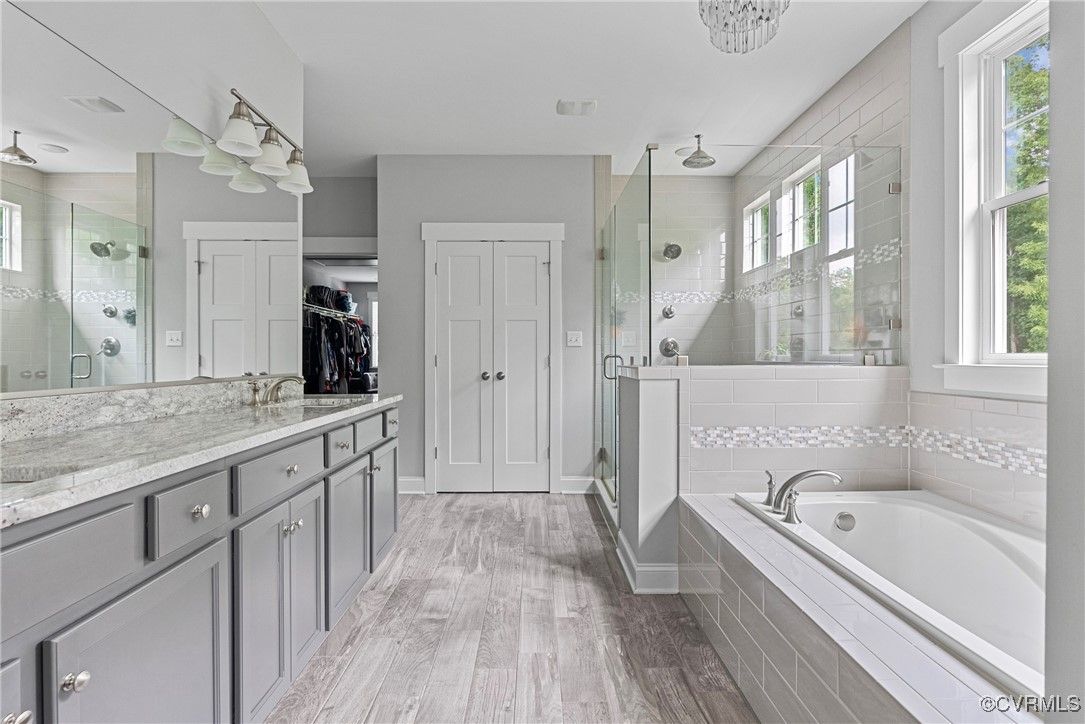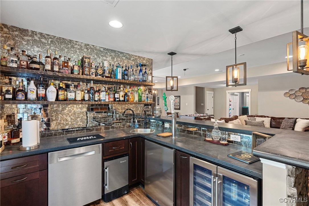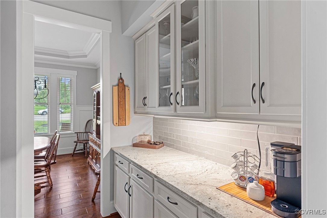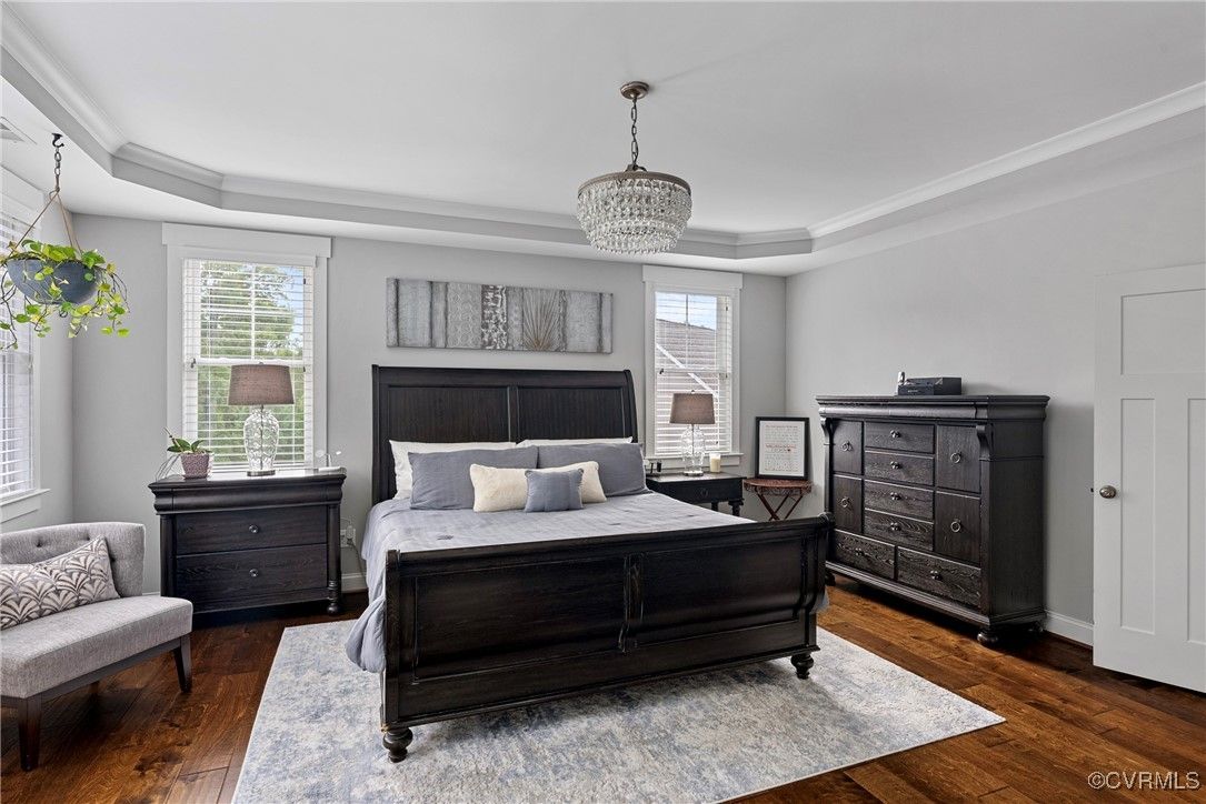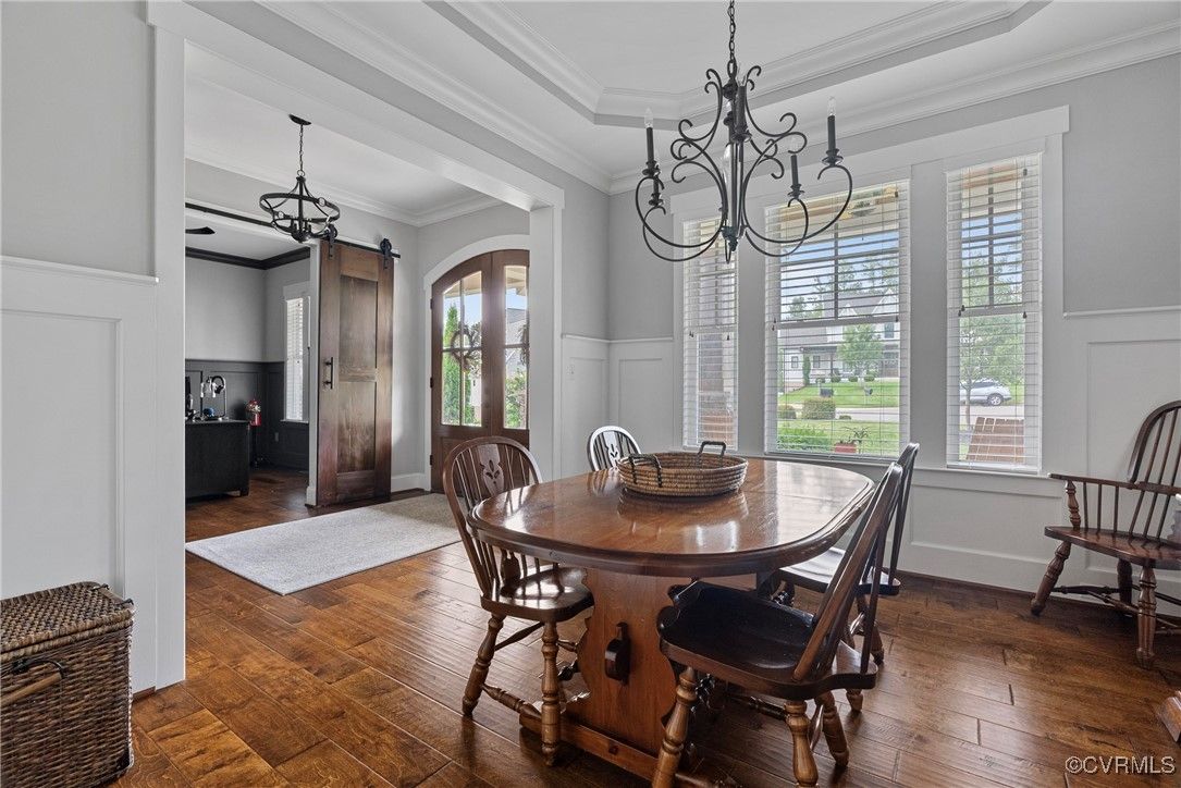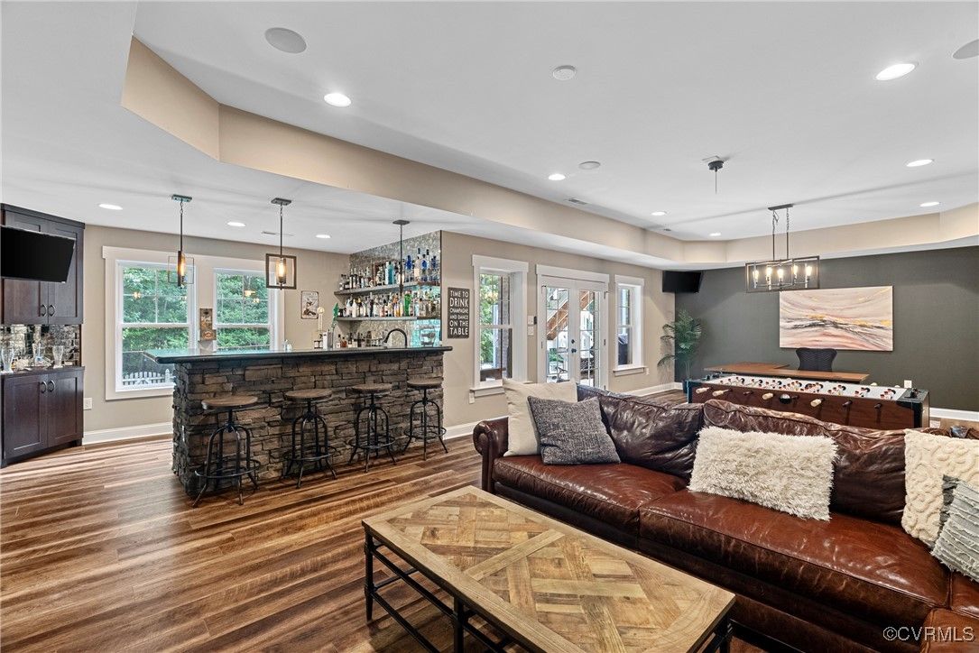 Welcome Home to this stunning, custom-built craftsman home in the heart of Hallsley, where sophistication meets modern luxury in sought after Midlothian. Note the detail of the architecture and grand facade of the rocking chair front porch and entry way. Guests are greeted by an inviting Foyer and spacious open Great Room with natural lighting, cozy stone gas log fireplace, and built-in speakers. The Chef's Dream Kitchen has oversized island, premium granite countertops, upgraded 48" cabinets, stainless double oven, gas cooktop, butler's pantry, and breakfast area with built-in storage benches. The elegant Dining Room is perfect for hosting, and the first-floor office/study has built-in bookcases and custom wainscoting. Character and charm along with gorgeous hardwood flooring and 10' ceilings are throughout the first floor. The well-designed 2nd floor has a luxurious primary owner's suite with hardwood floors, spa-like en-suite bathroom with soaking tub, large double vanity, and oversized tiled shower, and a gigantic walk-in closet. The 2nd largest bedroom has a private bathroom and walk-in closet. Bedrooms 3 and 4 share a good-sized jack & jill bathroom. The beautifully designed laundry room features a wash sink, built-in cabinets, folding counter area. The 3rd floor walk-up attic is roughed in for a 5th bath and can be finished. The walk-out basement is perfect for entertaining! If you wish to host a big party to watch the Olympics or convert to an in-law suite, the large recreational room has multiple TVs and built-in speakers, wet bar equipped with two-tap kegerator and wine fridge. Also exercise room with rubber floor, full bathroom and unfinished storage. Step out to the cozy and private back patio; enjoy your backyard oasis including a recently added gorgeous stone firepit area with party lights, fun play area, gardening space, and mature landscaping against wooded backdrop. The triple car garage is finished and has excellent storage with built-in cabinets.