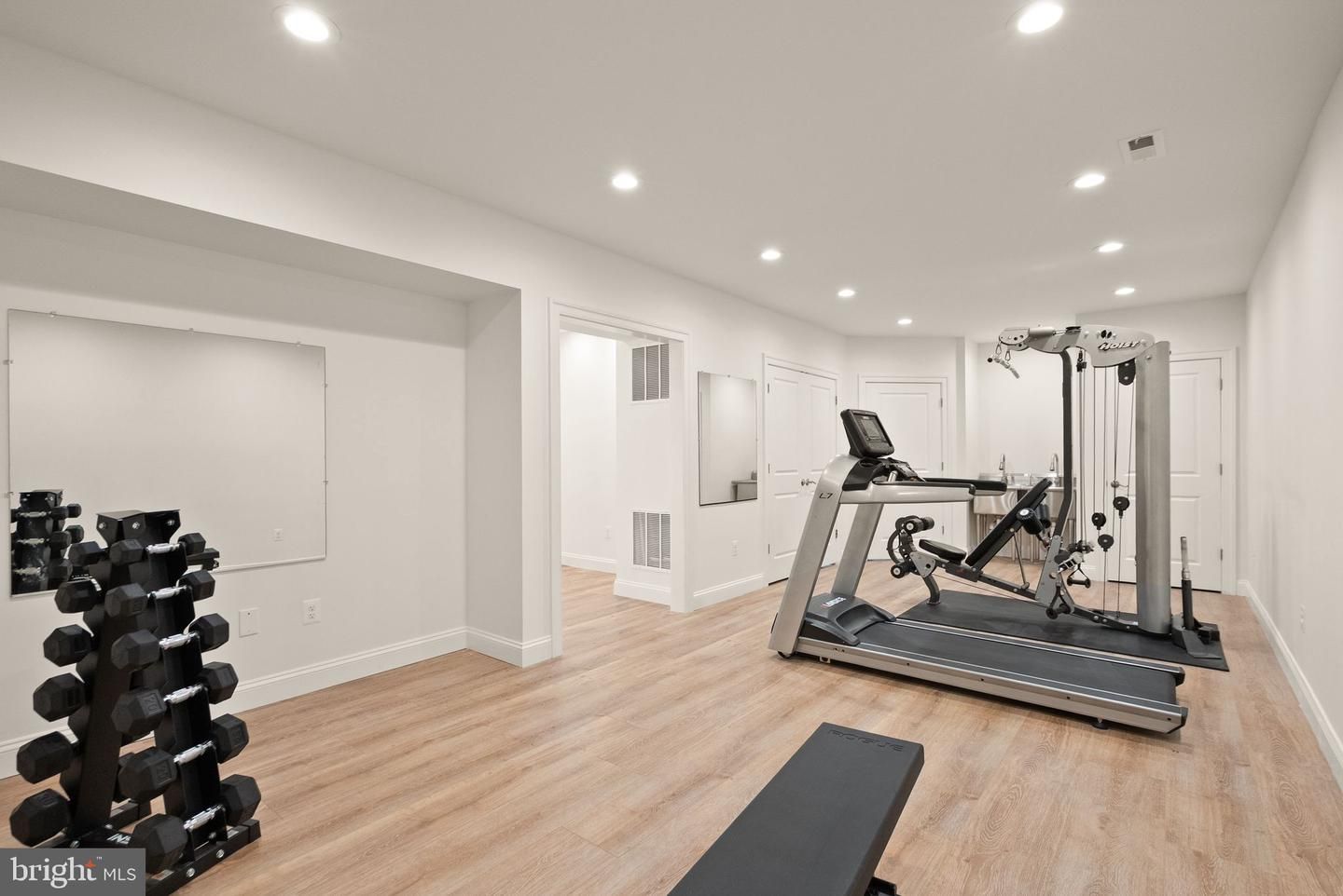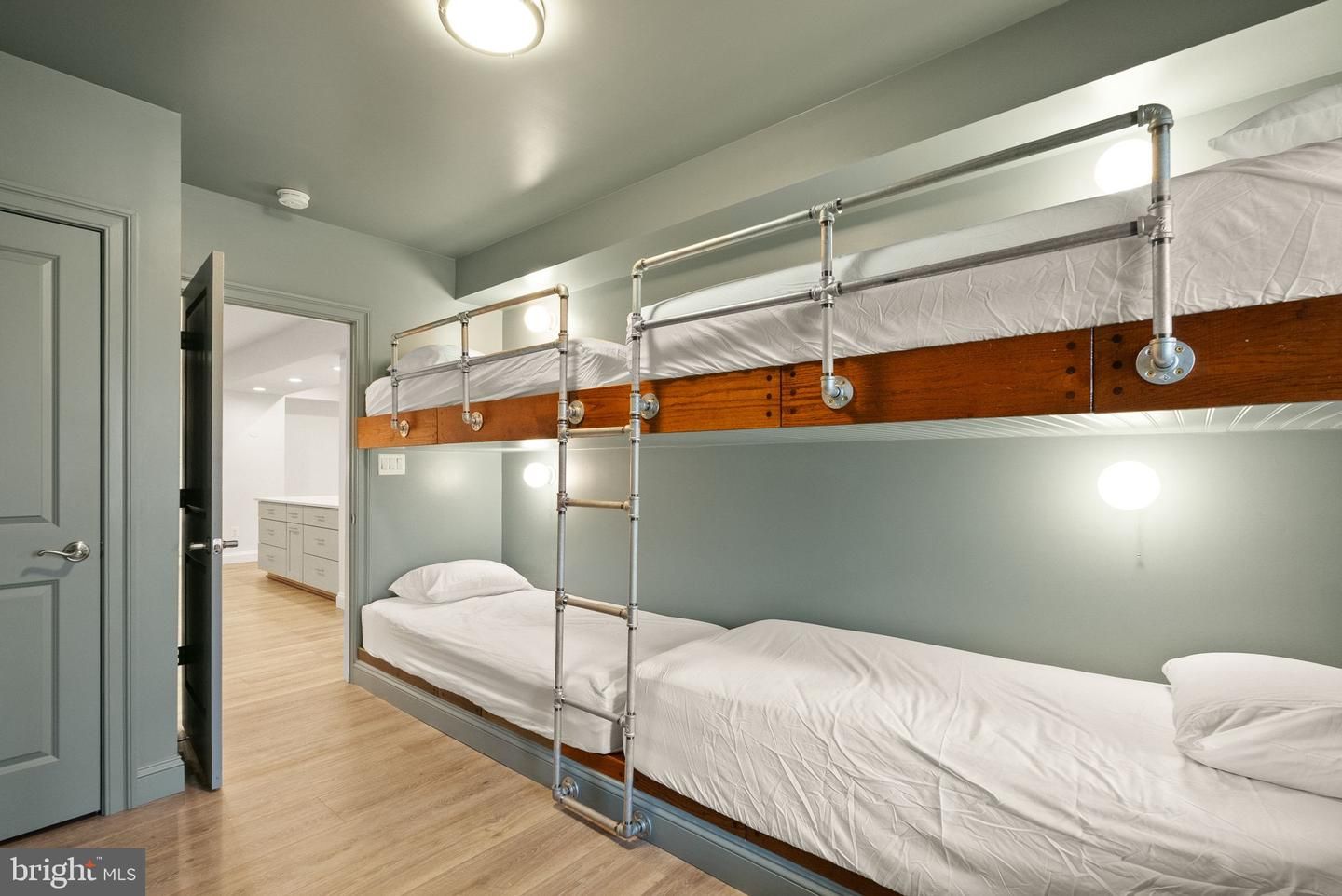 The walk-out lower level is an entertainer’s dream, featuring a full kitchen with quartz countertops and stainless steel appliances, a custom wood burning fireplace, two additional bedrooms including one with four custom built-in bunk beds, a full bathroom with a large walk in shower, a washer and dryer hookup, a home gym, storage, creative spaces including a Lego closet and display area, abundant natural light, recessed lighting, and LVP flooring.